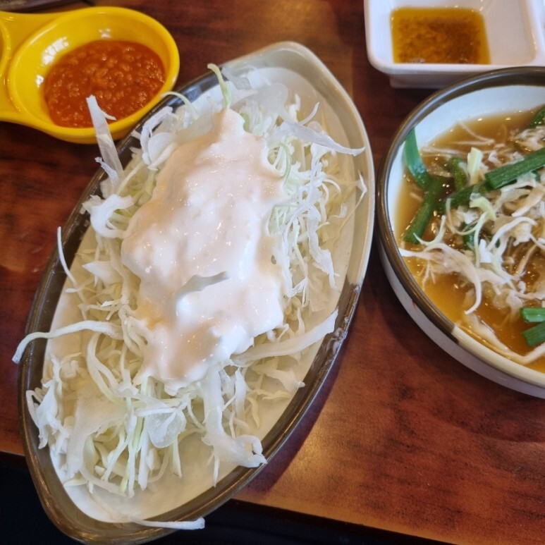 기본 찬으로 고기랑 먹는 소스와 야채, 소스들