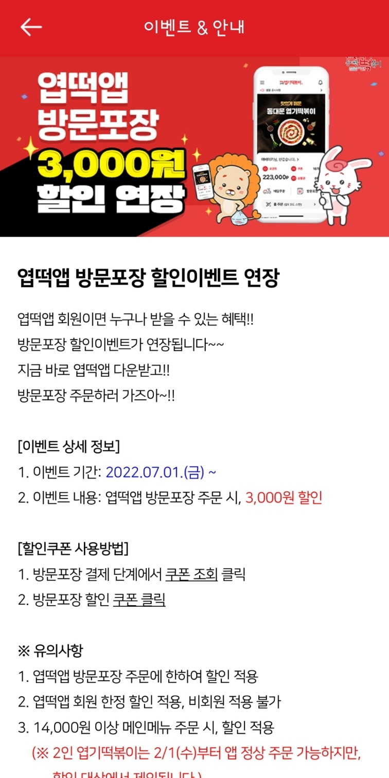 엽떡 어플로 방문포장 주문을 하면 3,000원 할인 쿠폰을 받을 수 있다!