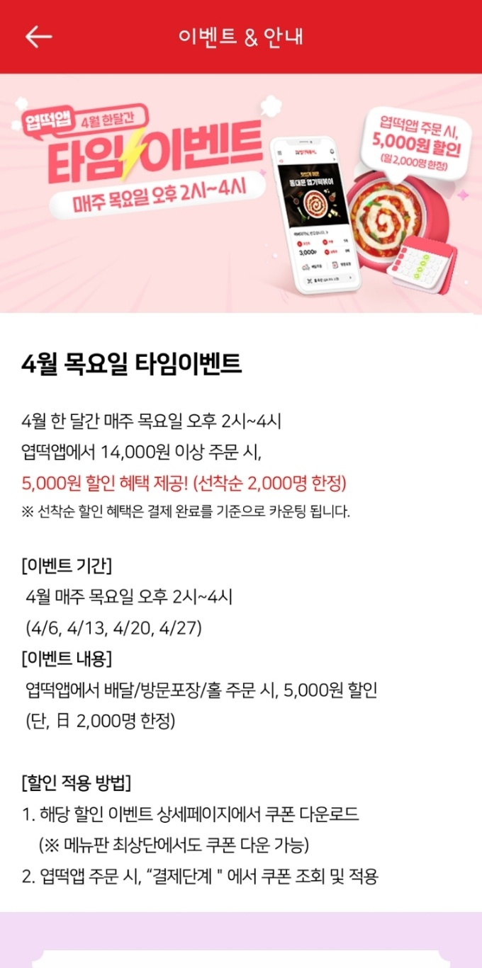 4월 목요일 한달동안 오후 2시~4시 사이에 엽떡앱으로 14,000원 이상 주문 시 5,000원 할인쿠폰을 선착순 2,000명에서 제공한다 한다!(하루 이천명)