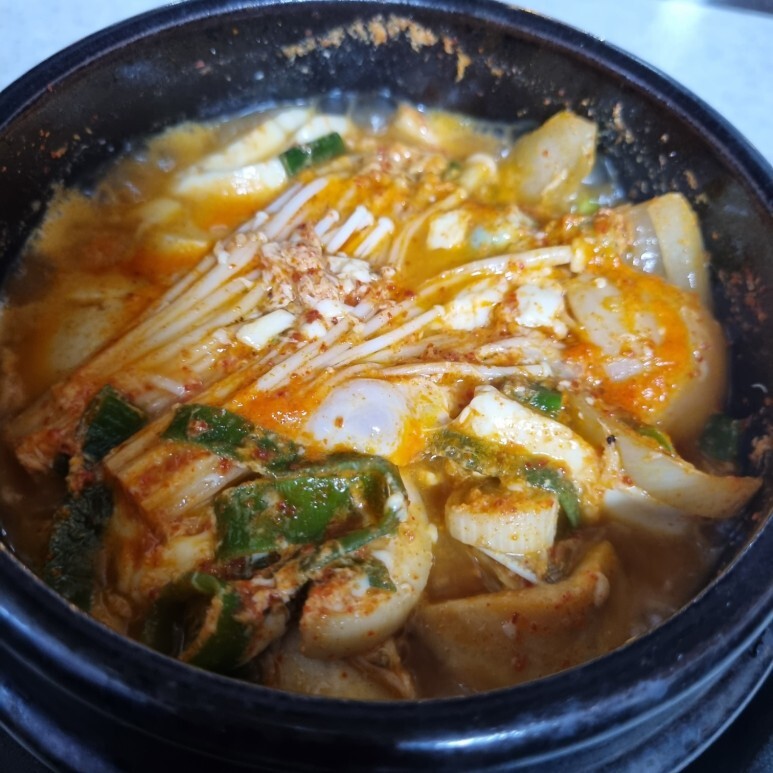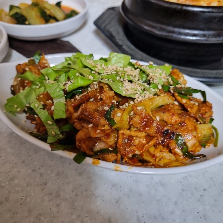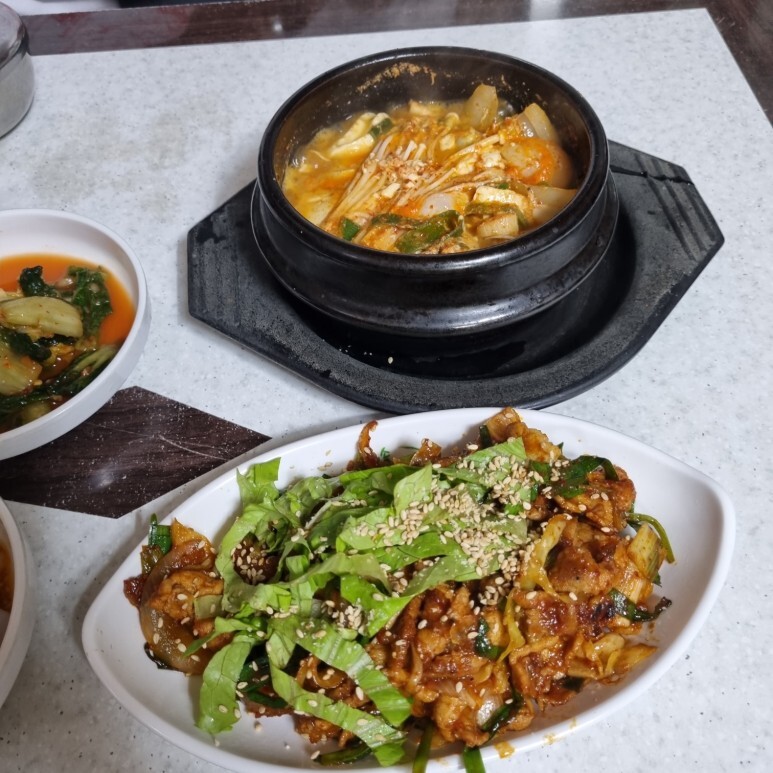 우리는 제육볶음과 순두부 찌개를 시켰다.