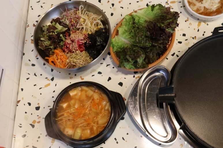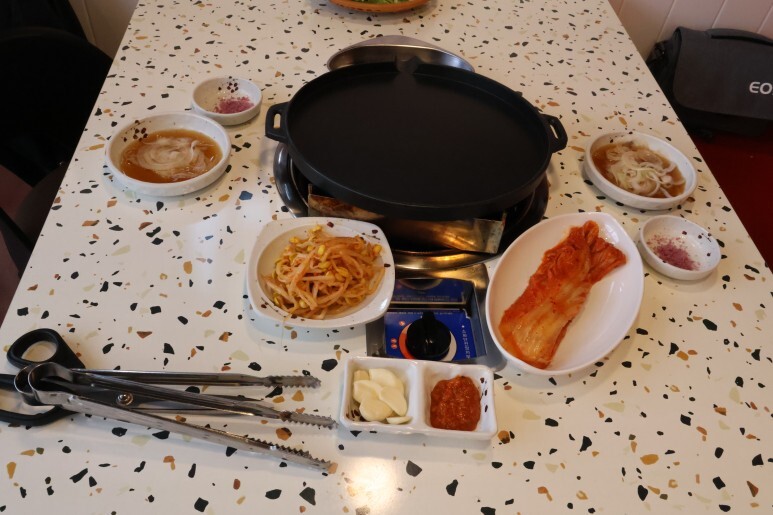 구워 먹을 수 있는 김치, 콩나물 무침, 그리고 고기와 같이 먹을 양파와 소스, 소금!